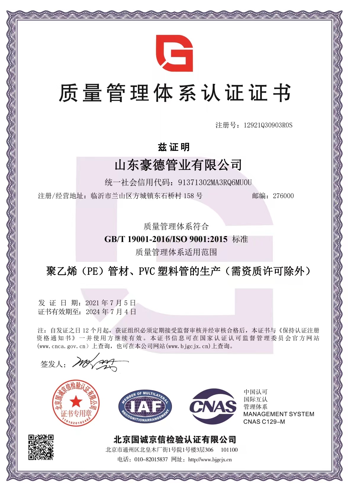 山東豪德管業(yè)有限公司豪德——專業(yè)pe管材生產廠家公司是聚乙烯PE管材管件生產建設基地,年產各類PE管材近億噸,綜合性能好。